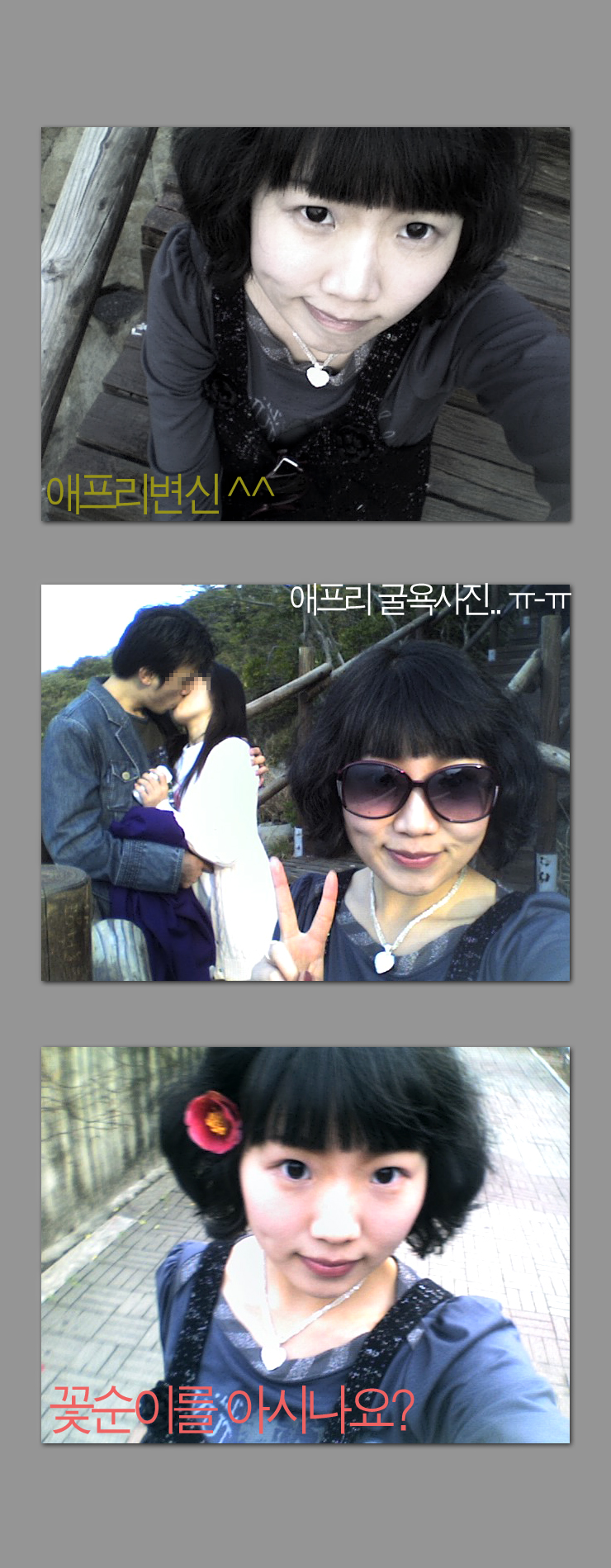 ㅋㅋ 두번째 사진은 충격 저도 머리 짤랐는데 이미지 변신은 무슨 ㅡ,.ㅡ 촌닭됐어요 허리까지오는 머리였는데 미용사가 잘못짤라서 단발됐거든요 ㅋ