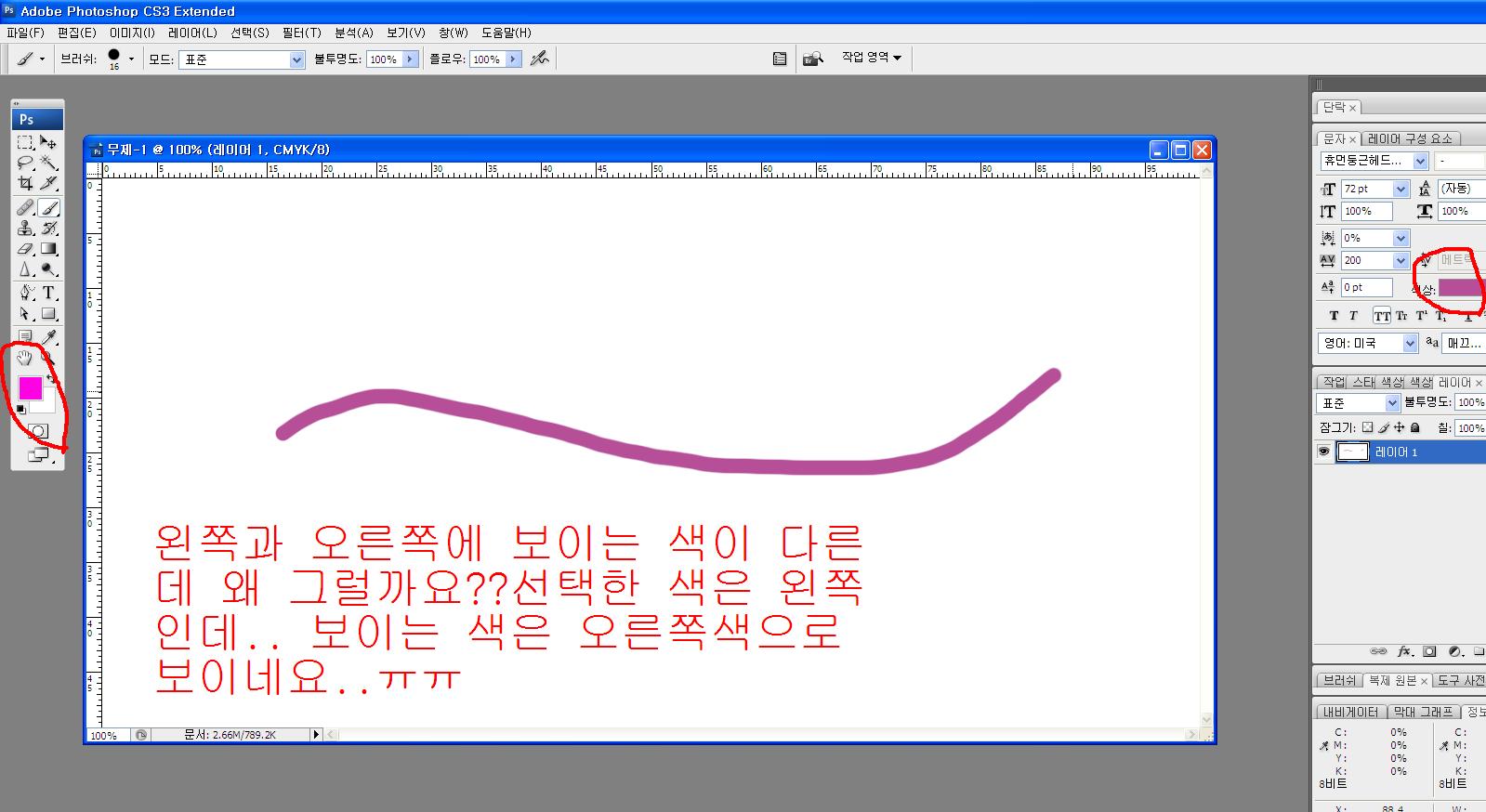 브러쉬 사용할 때 색상선택을 하는데... 선택한 색상보다 탁한 색이 칠해지더라구요...