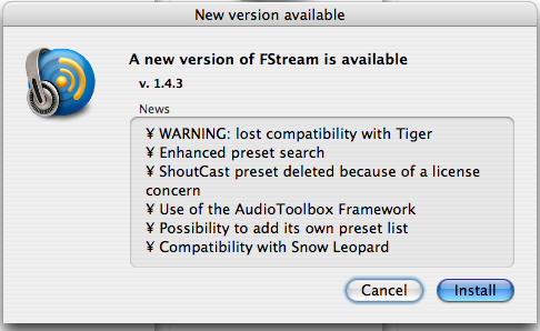 네~ 예측하고 계신 바와 같이, 업데이트를 하게 되면 라이센스 문제로 인해 ShoutCast Preset 파일이 삭제되며, 이로 인해 타이거와의 호환성을 잃게 된다는 내용입니다.